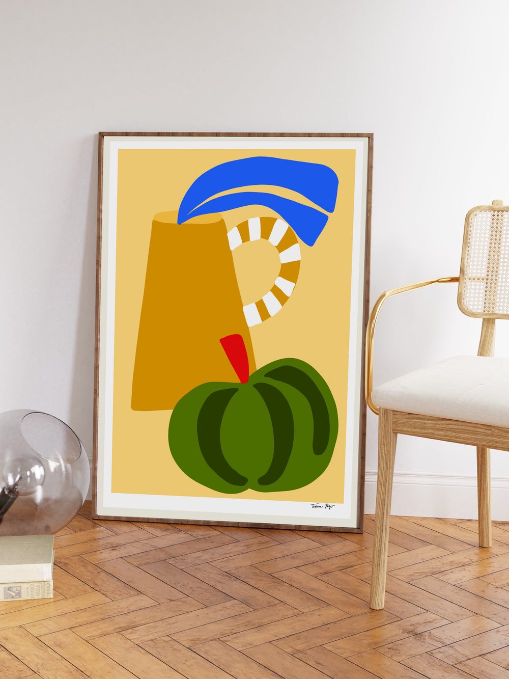 The "Green Pumpkin and Ocher Pot" print by Teresa Rego is a striking blend of rich colors and organic shapes.